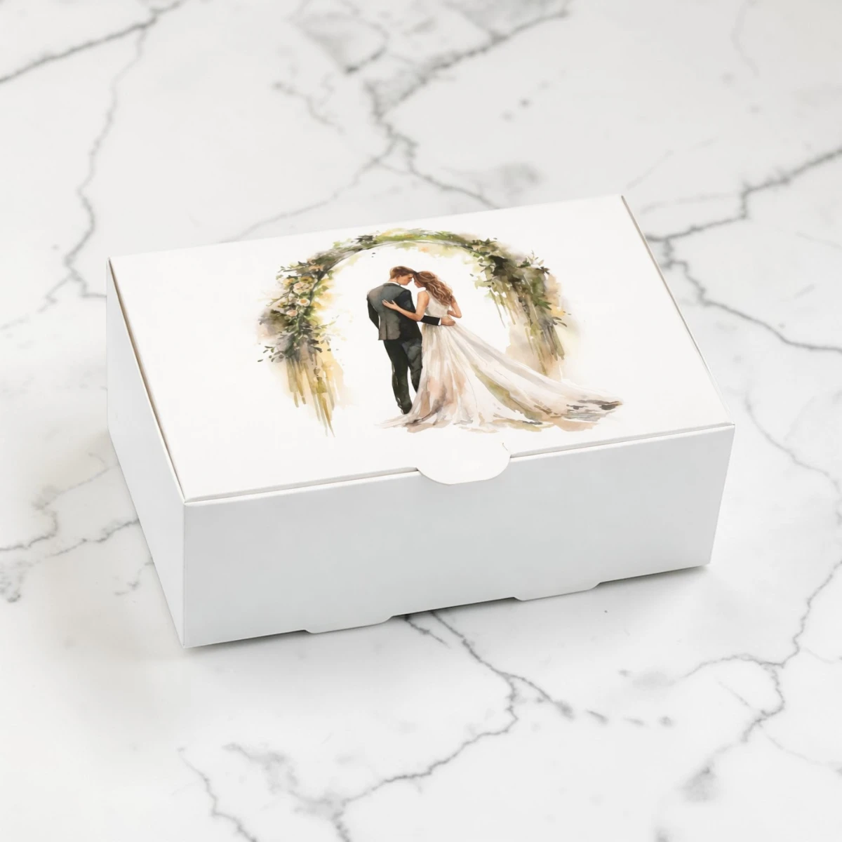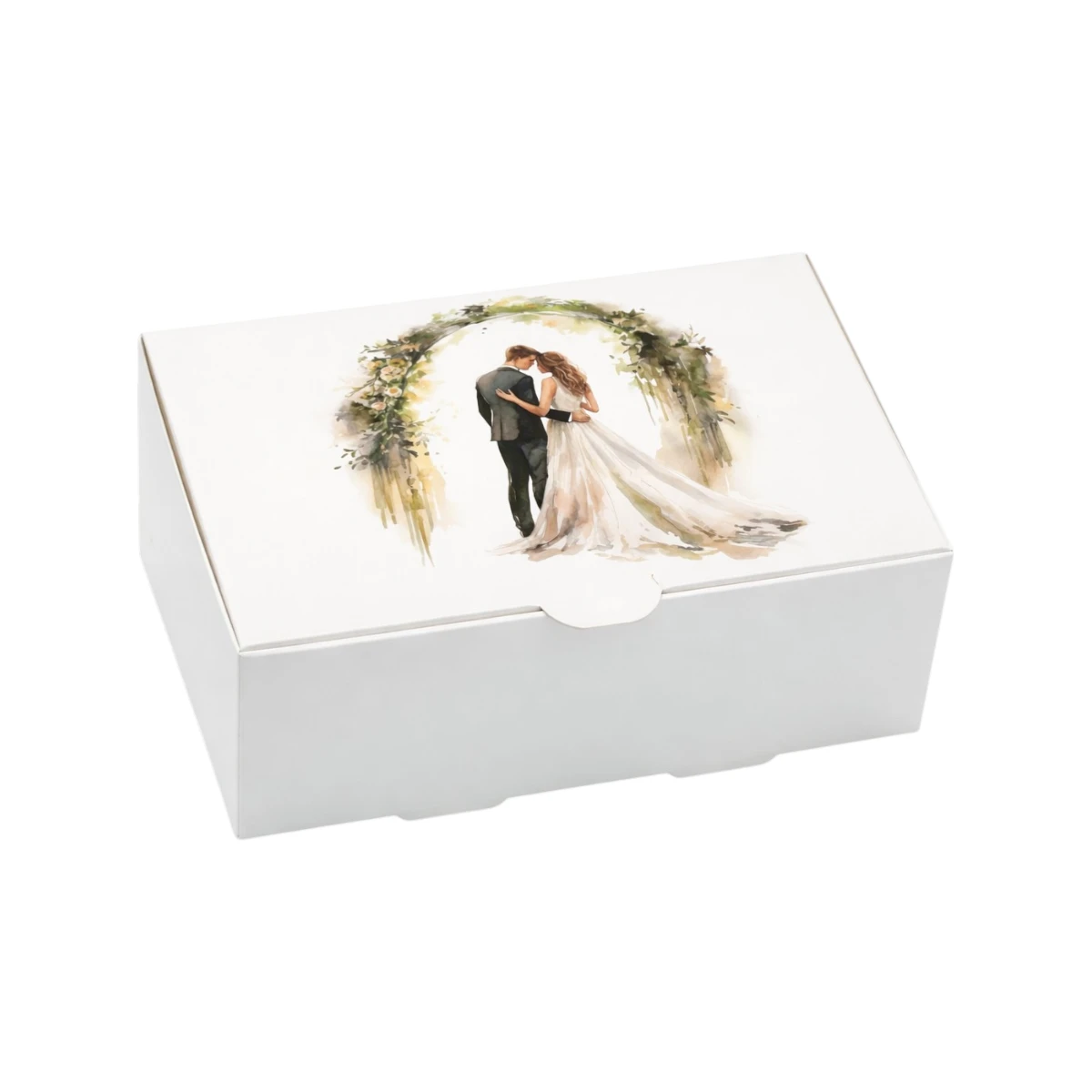 Cutie de prăjitură cu miri CP304, decorată cu un design romantic ce surprinde un cuplu de miri încadrat de o arcadă florală în nuanțe verzi. Acest model transmite eleganță, naturalețe și rafinament, fiind perfect pentru evenimente precum nunți sau cununii.
