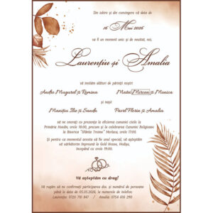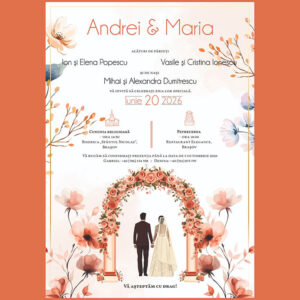 Invitația digitală 02 se remarcă printr-un design artistic, în nuanțe calde de terracotta și accente grafice moderne, completate de fonturi elegante și bine echilibrate. Compoziția este aerisită, iar detaliile subtile oferă un aspect premium, potrivit pentru nunți moderne sau evenimente cu tematică romantică.