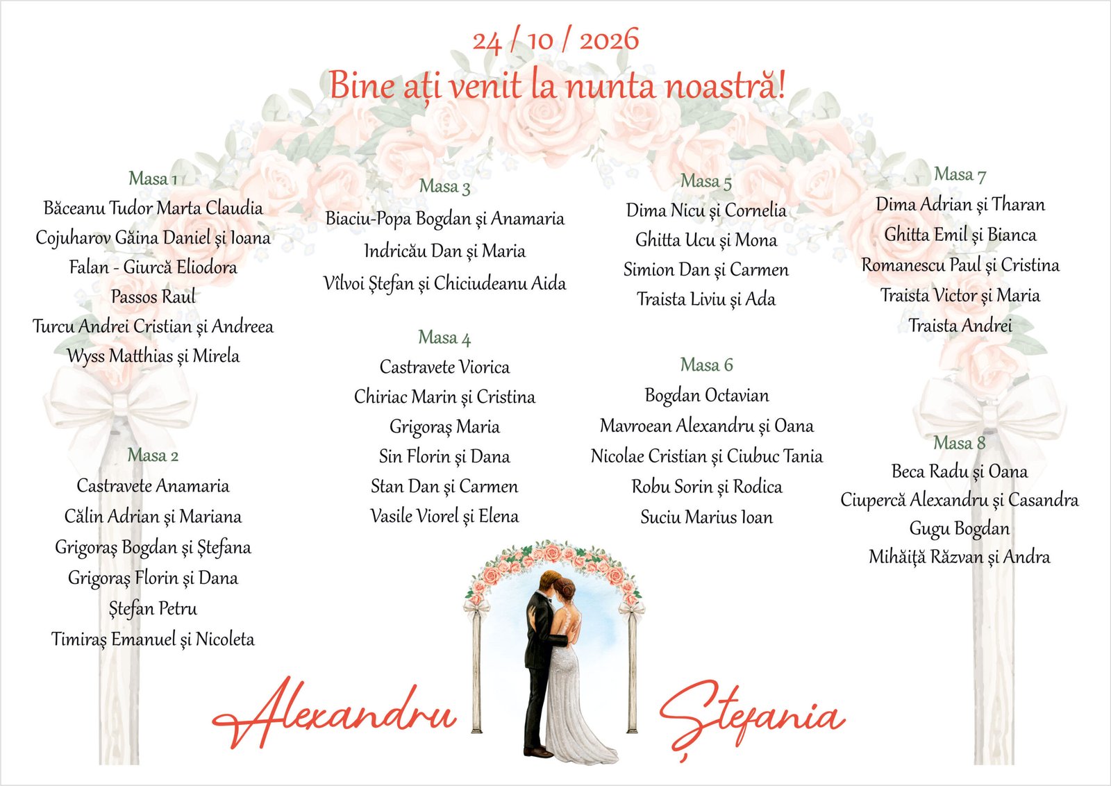 Lista de invitați Model 34 aduce în prim-plan doi miri așezați sub o arcadă superbă de flori, într-o postură plină de emoție și simbolism. Cei doi privesc spre cer, dar sunt întorși către noi, transmitând puritate, speranță și unitate — un moment surprins într-un design artistic impecabil.