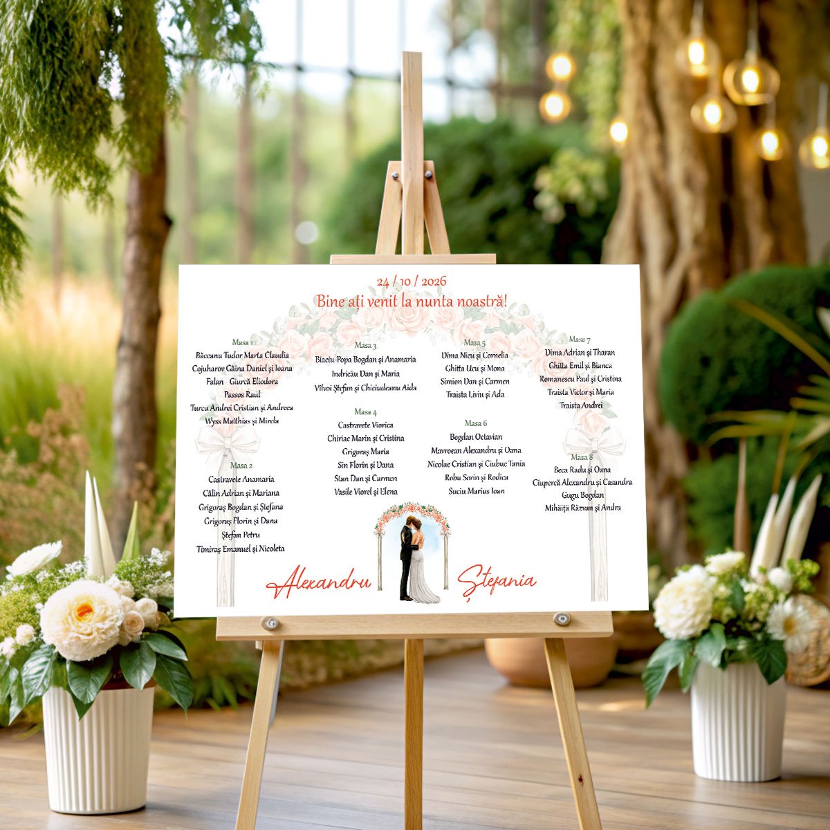 Arcada florală, bogată și armonioasă, încadrează scena într-un mod romantic, iar culorile atent alese completează perfect atmosfera: delicatețe, eleganță și profunzime. Acest opis este ideal pentru nunți rafinate, moderne sau clasice, fiind o piesă centrală care adaugă valoare, semnificație și farmec evenimentului.