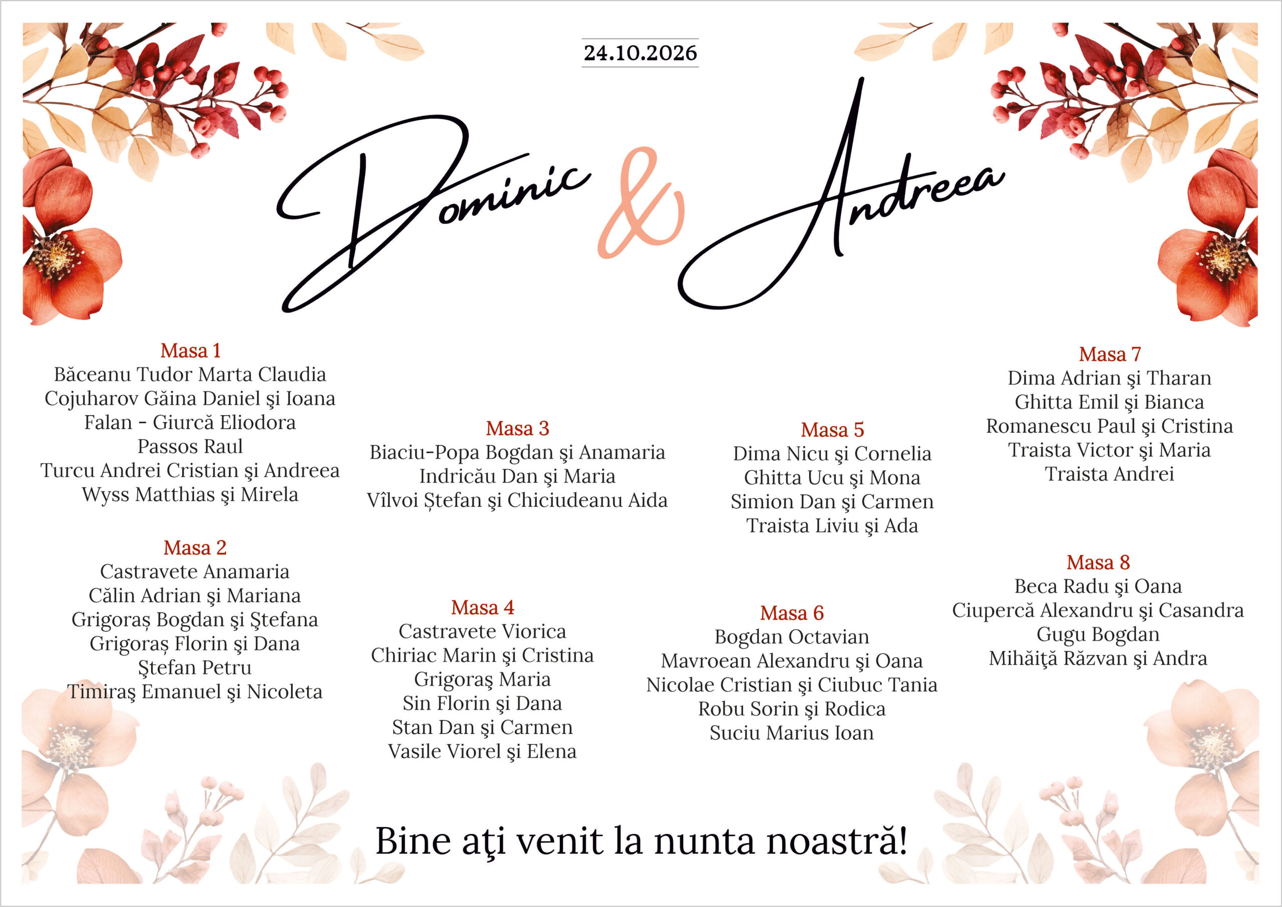 Lista de invitați Model 16 este un opis idilic de toamnă, creat pentru evenimente care pun accent pe eleganță, armonie și detalii atent alese. Designul include elemente florale specifice sezonului, completate de flori în nuanțe cenușii și accente în culori calde, care evocă atmosfera liniștită și rafinată a toamnei.