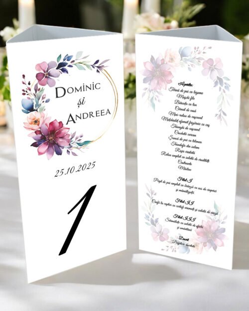 Va propunem un meniu pentru masa foarte elegant si aranjat. In intereriorul meniul vom plasa textul dorit pentru meniu. Putem aranja pe partea stanga mancarea si pe partea dreapta bautura.