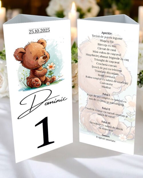 Meniurile în formă de triunghi îmbină perfect estetica, funcționalitatea și organizarea. Pe lângă prezentarea elegantă a preparatelor și băuturilor, acestea integrează și numărul mesei, un detaliu esențial pentru desfășurarea impecabilă a evenimentului. Important: După plasarea comenzii, în termen de 1-2 zile lucrătoare, veți primi o machetă grafică pentru verificare, prin e-mail sau WhatsApp. Tipărirea se realizează doar după ce primim acordul dumneavoastră final.