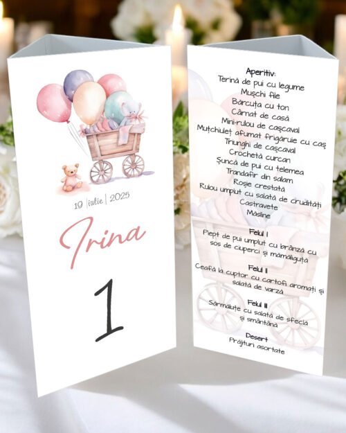 Modelul 20 aduce un aer clasic și vintage, ideal pentru părinții care apreciază eleganța tradițională și detaliile pline de farmec. Designul, în nuanțe delicate de mov, prezintă o fetiță adorabilă, un căruț vintage mov și o fundă decorativă, completând perfect atmosfera unui botez plin de rafinament și emoție.