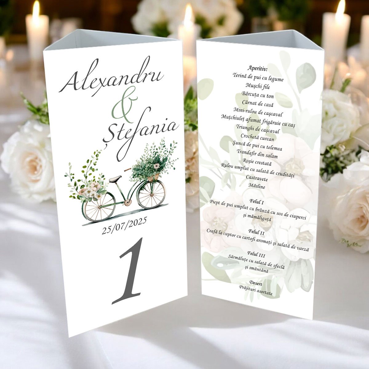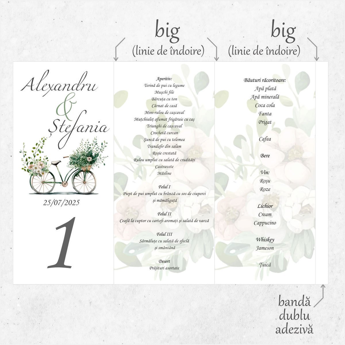 Meniu triunghi floral model 35 – floral, pe verde, bicicleta vintage, flori verzi
