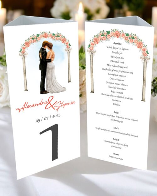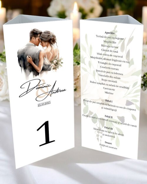 Meniurile în formă de triunghi îmbină perfect estetica, funcționalitatea și organizarea. Pe lângă prezentarea elegantă a preparatelor și băuturilor, acestea integrează și numărul mesei, un detaliu esențial pentru desfășurarea impecabilă a evenimentului. Important: După plasarea comenzii, în termen de 1-2 zile lucrătoare, veți primi o machetă grafică pentru verificare, prin e-mail sau WhatsApp. Tipărirea se realizează doar după ce primim acordul dumneavoastră final.