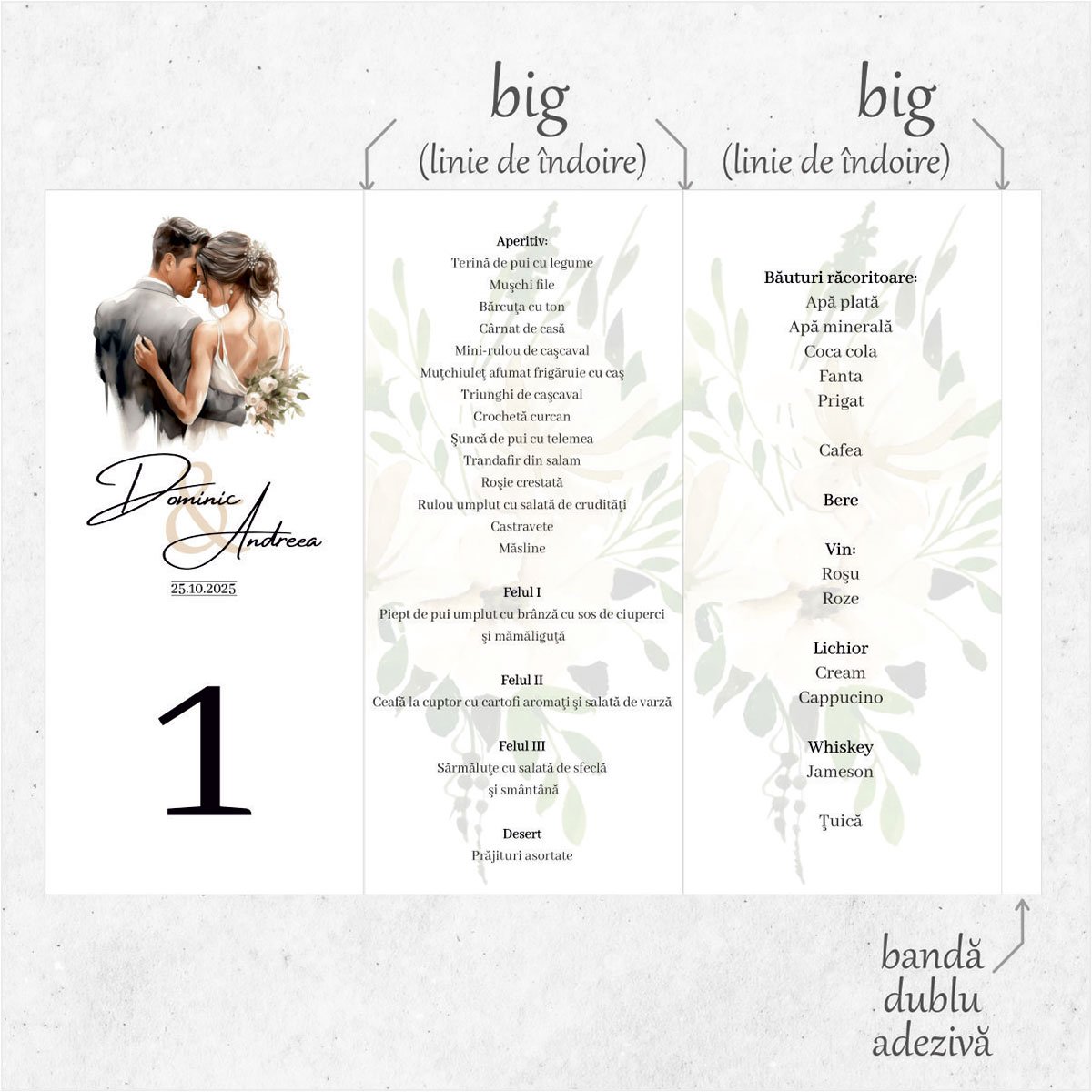 Un meniu realizat manual (handmade), confecționat din carton alb mat de calitate superioară, pliat sub forma unui triunghi elegant și fixat cu ajutorul benzii adezive incluse.