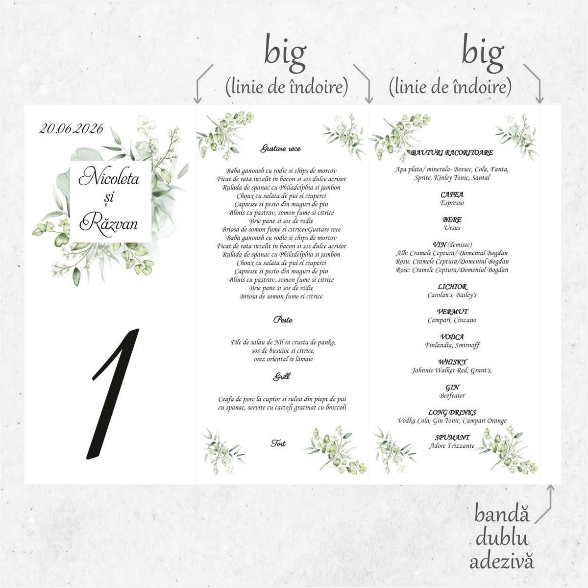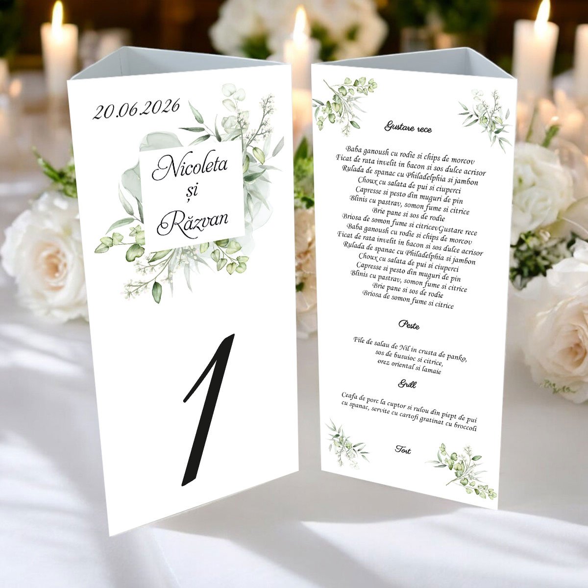 Un meniu realizat manual (handmade), confecționat din carton alb mat de calitate superioară, pliat sub forma unui triunghi elegant și fixat cu ajutorul unei benzi adezive incluse.