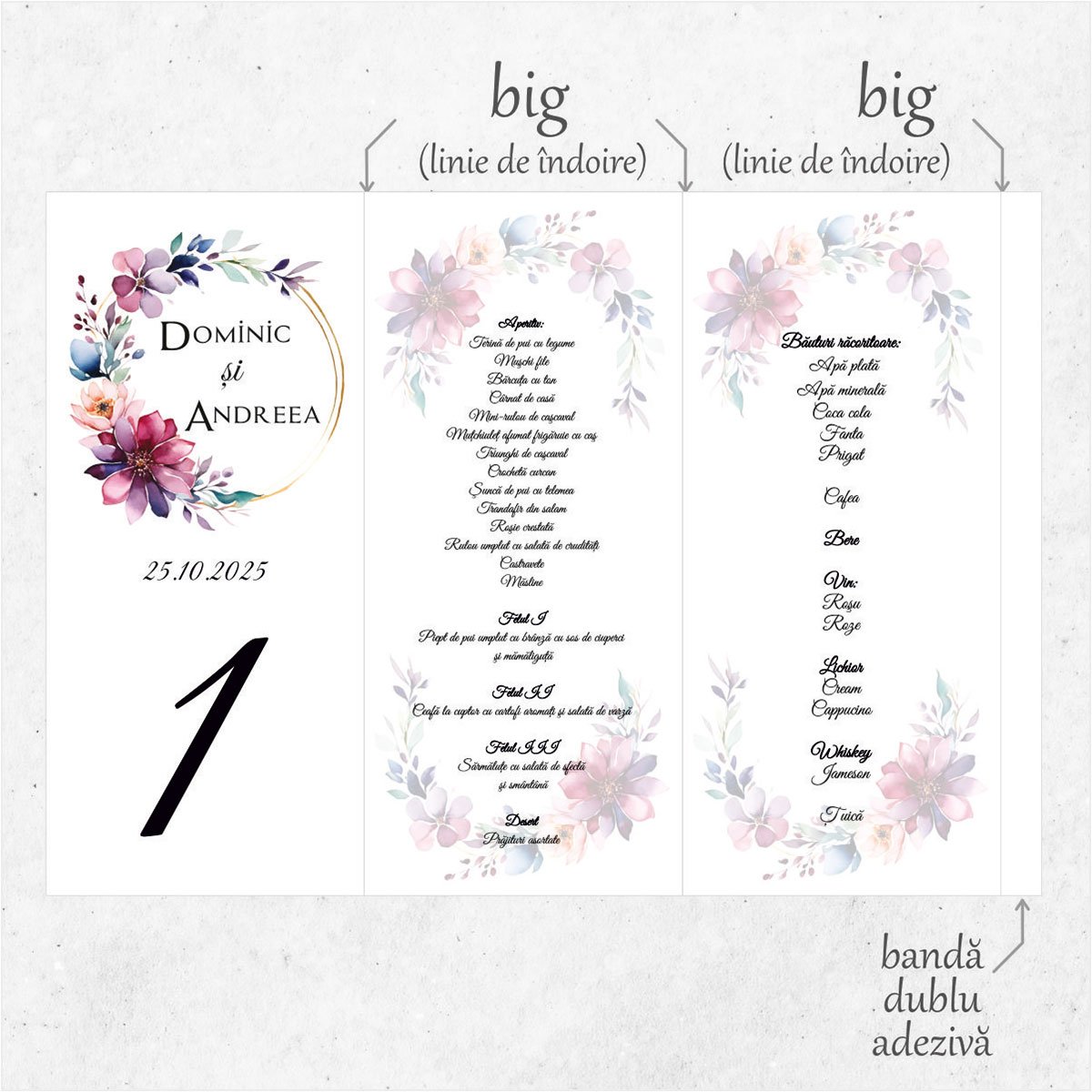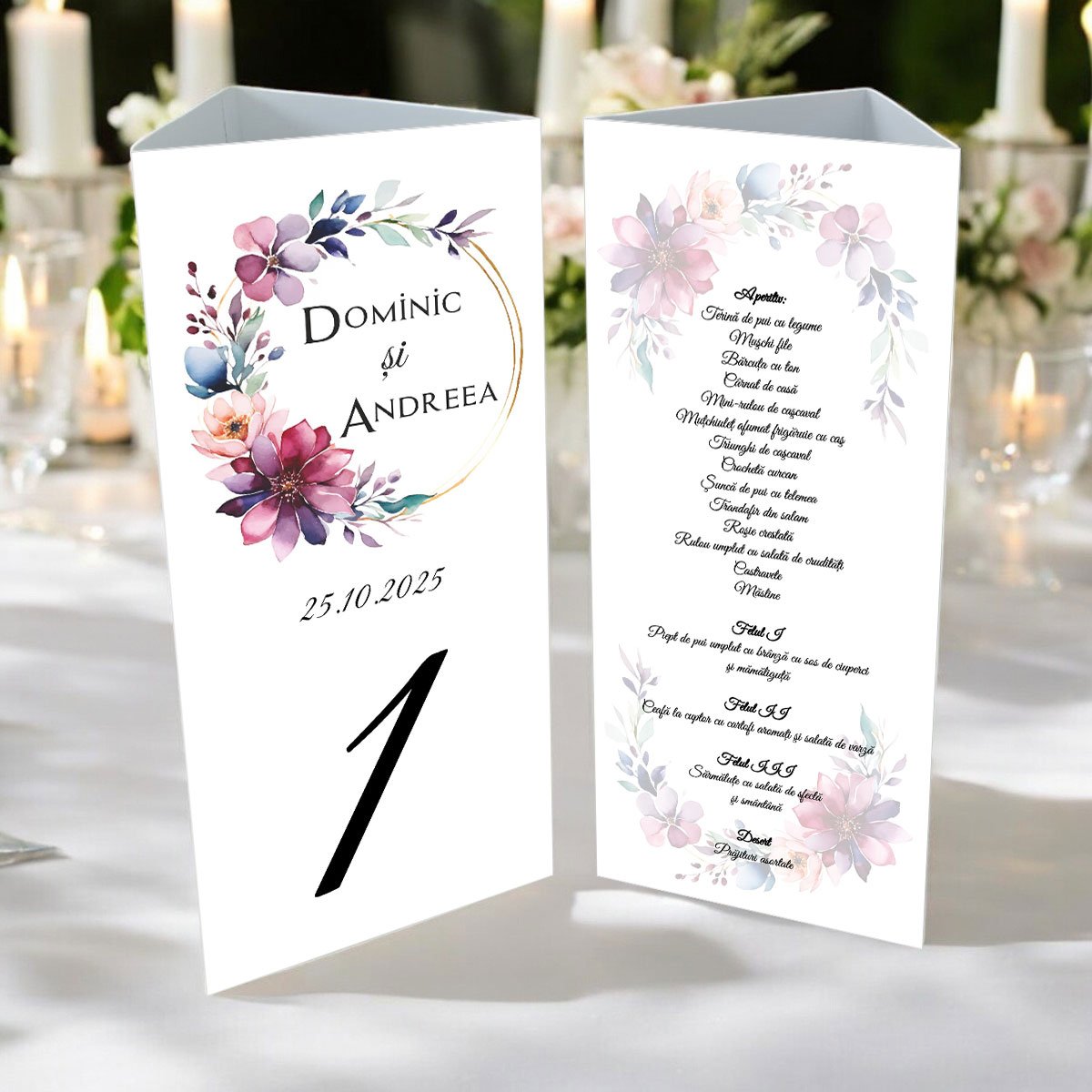 Un meniu realizat manual (handmade), confecționat din carton alb mat de calitate superioară, pliat sub forma unui triunghi elegant și fixat cu ajutorul unei benzi adezive incluse.