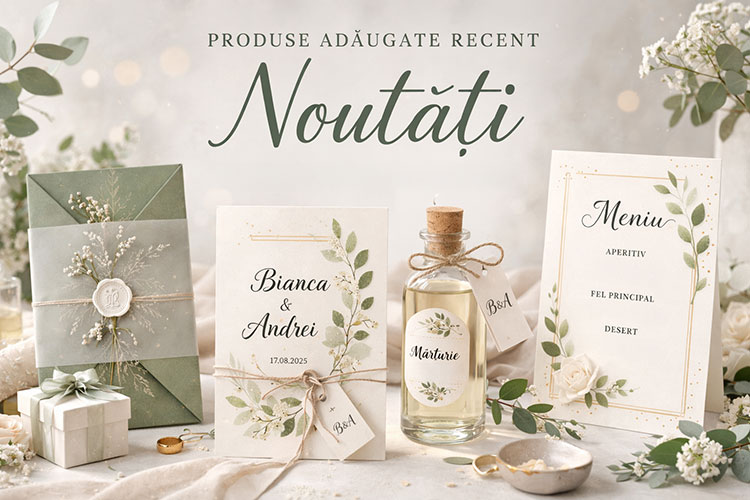 Descoperă cele mai noi produse adăugate în colecția noastră de invitații, mărturii și accesorii pentru nuntă și botez.
