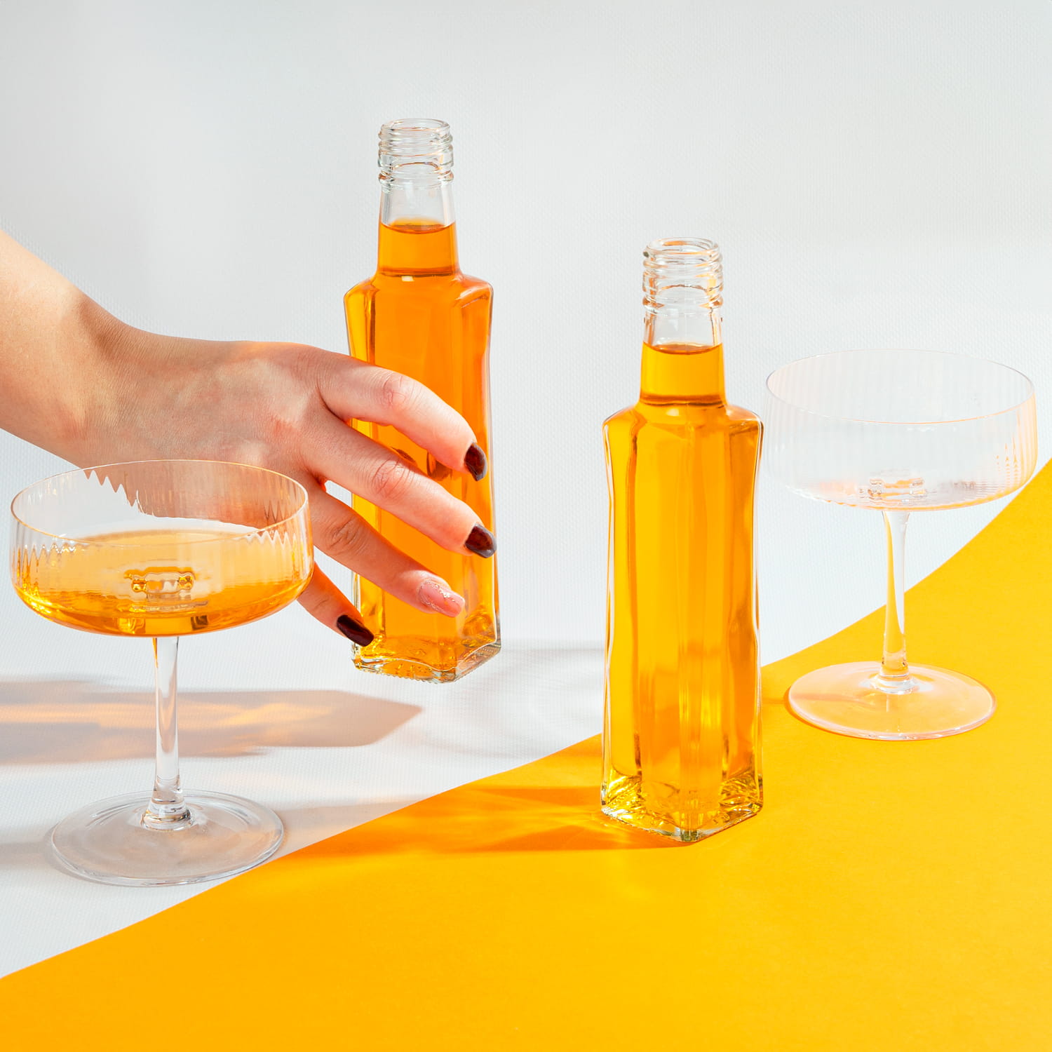 Perfectă pentru a fi umplută cu băuturi rafinate precum vin, lichior sau uleiuri aromate, sticla Runa se distinge prin stilul său versatil. Este ideală atât pentru nunți cu tematici clasice, cât și pentru evenimente moderne, fiind un detaliu deosebit care va adăuga un plus de eleganță evenimentului vostru.