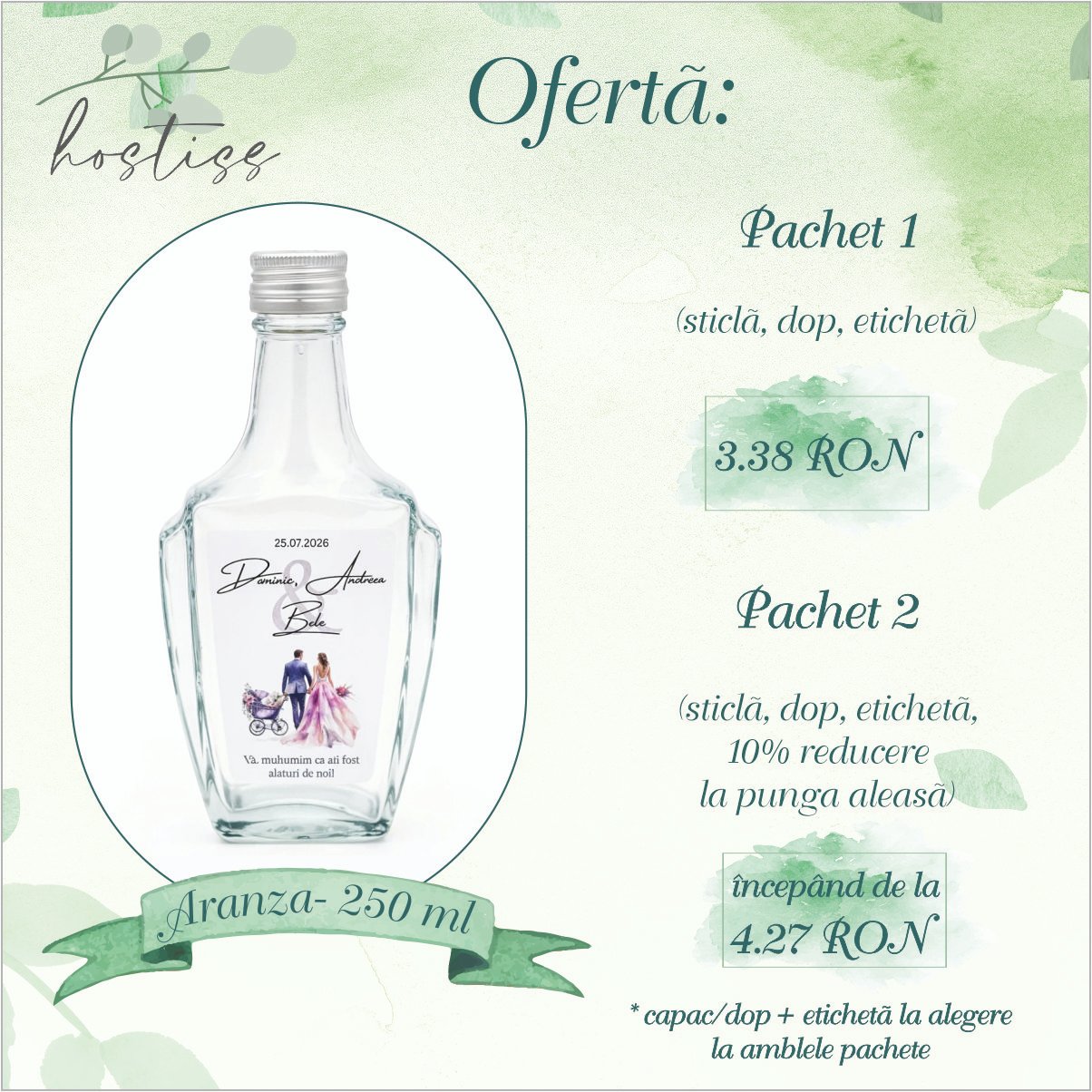 Sticla Mărturie Nuntă 250 ml Aranza este alegerea perfectă pentru cei care își doresc o mărturie cu adevărat deosebită 💖. Cu un design unic, forme elegante și un aspect premium, acest model nou pe piața din România va atrage imediat privirile fiecărei mirese 👰 și va oferi un plus de rafinament oricărui eveniment.