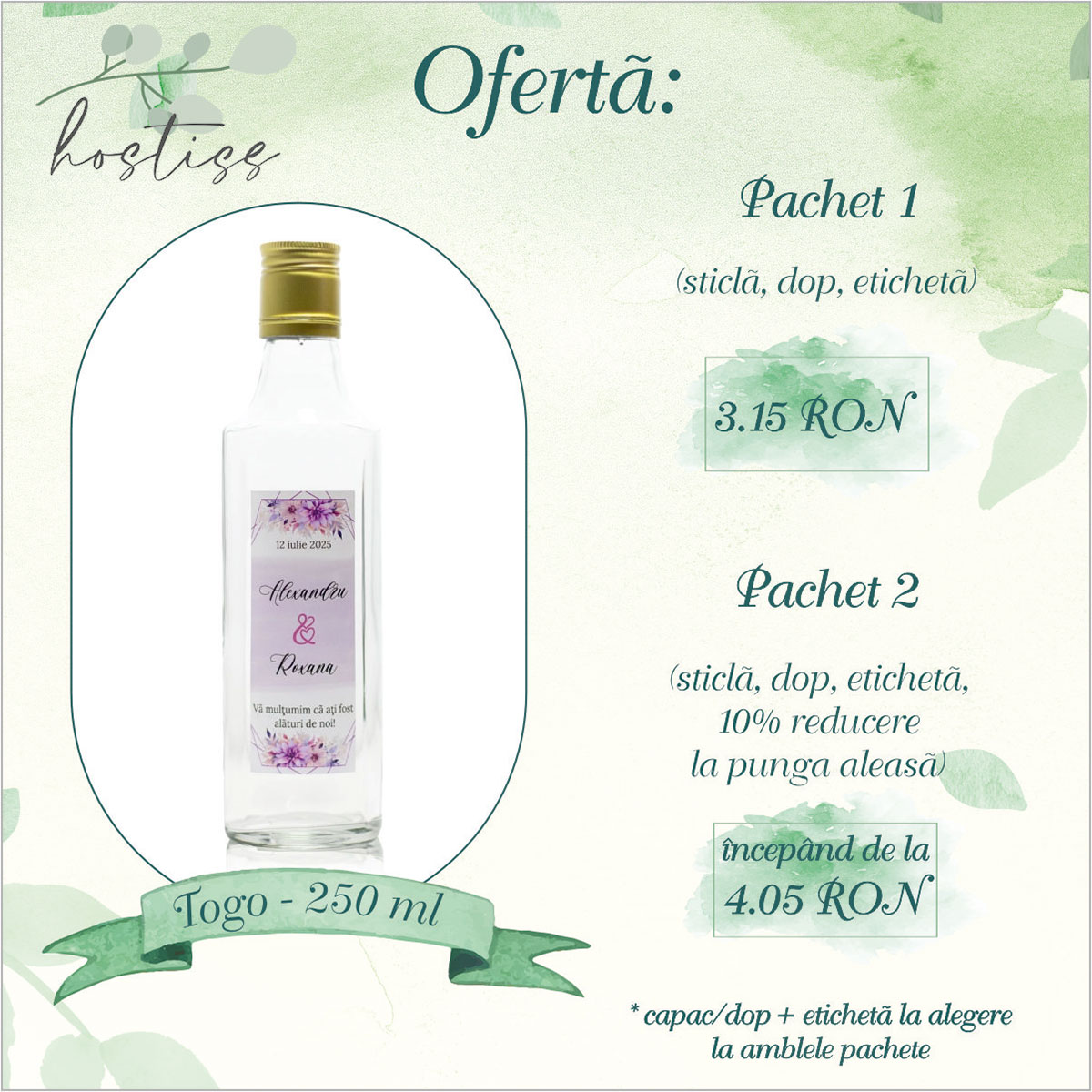 Unul dintre marile avantaje ale sticlei Togo este raportul ideal între calitate și preț. Nu trebuie să faci compromisuri între stil și buget – această sticlă oferă o apariție premium la un cost prietenos, fiind potrivită atât pentru evenimente intime, cât și pentru nunți mai ample. 💡
